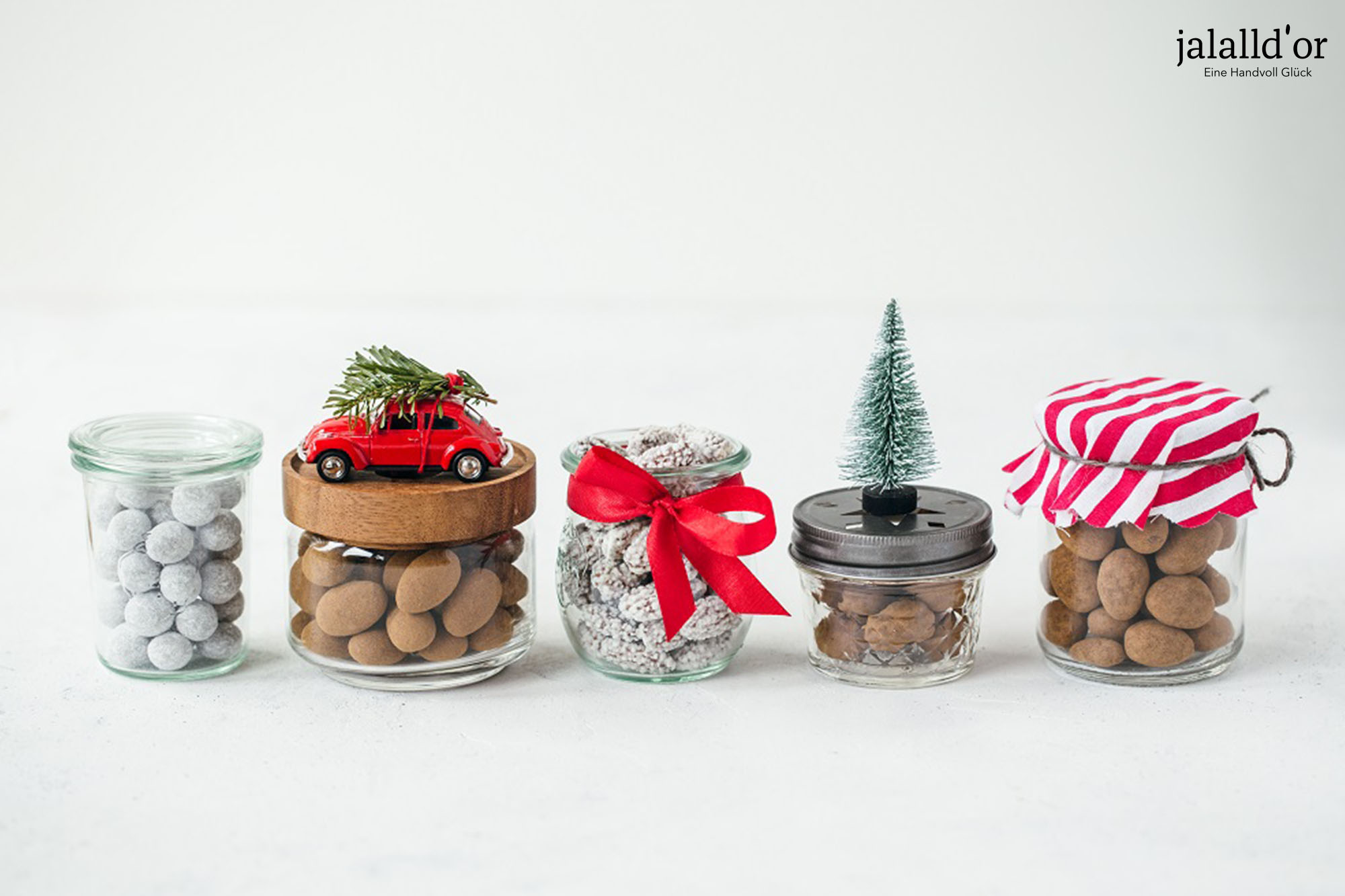 Weihnachtszauber - Weihnachtsmix mit gebrannten Mandeln kaufenAufgepasst - jetzt wird es zauberhaft weihnachtlich bei Jalall D’or, denn endlich ist wieder Saison für unseren Weihnachtsmix mit gebrannten Mandeln!Unsere Nuss-Frucht-Mischung namens Weihnachtszauber hat sich auf den Weg gemacht und wartet nur darauf, sich ihren Platz unter dem Weihnachtsbaum zu sichern und alle Genießerherzen im Sturm zu erobern.Star der Mischung ist ein weihnachtlicher Klassiker, der auf keinem Weihnachtsmarkt fehlen darf: knusprig gebrannte Mandeln. Dazu gesellen sich saftige getrocknete Cranberries in Ananassaft, krosse Bananenchips Bio, zarte Cashewkerne Bio und als Zugabe schokolierte Cranberries Bio in weißer Schokolade mit einem Hauch Orange. Jetzt wird es gemütlich mit besonderen Weihnachtssüßigkeiten…Wir freuen uns auf die gemütliche Zeit des Jahres mit kuscheligen Abenden auf dem Sofa. Dazu ein gutes Buch, unsere feine Weihnachtszauber-Knabberei und ein wohlig-wärmendes Getränk wie Punsch, Glühwein oder Tee – was gibt es Herrlicheres zum Entspannen?Als Einstimmung auf die Weihnachtszeit passt unser Weihnachtsmix mit gebrannten Mandeln dabei fast so perfekt wie die rote Nase zu Rentier Rudolph 😉Weihnachtsmischung – die weihnachtliche GeschenkideeAls Geschenkidee zu Weihnachten haben Sie bei unserem Weihnachtsmix mit gebrannten Mandeln eine passende Idee in verschiedenen Verpackungsdesigns für Ihre Kundschaft parat.