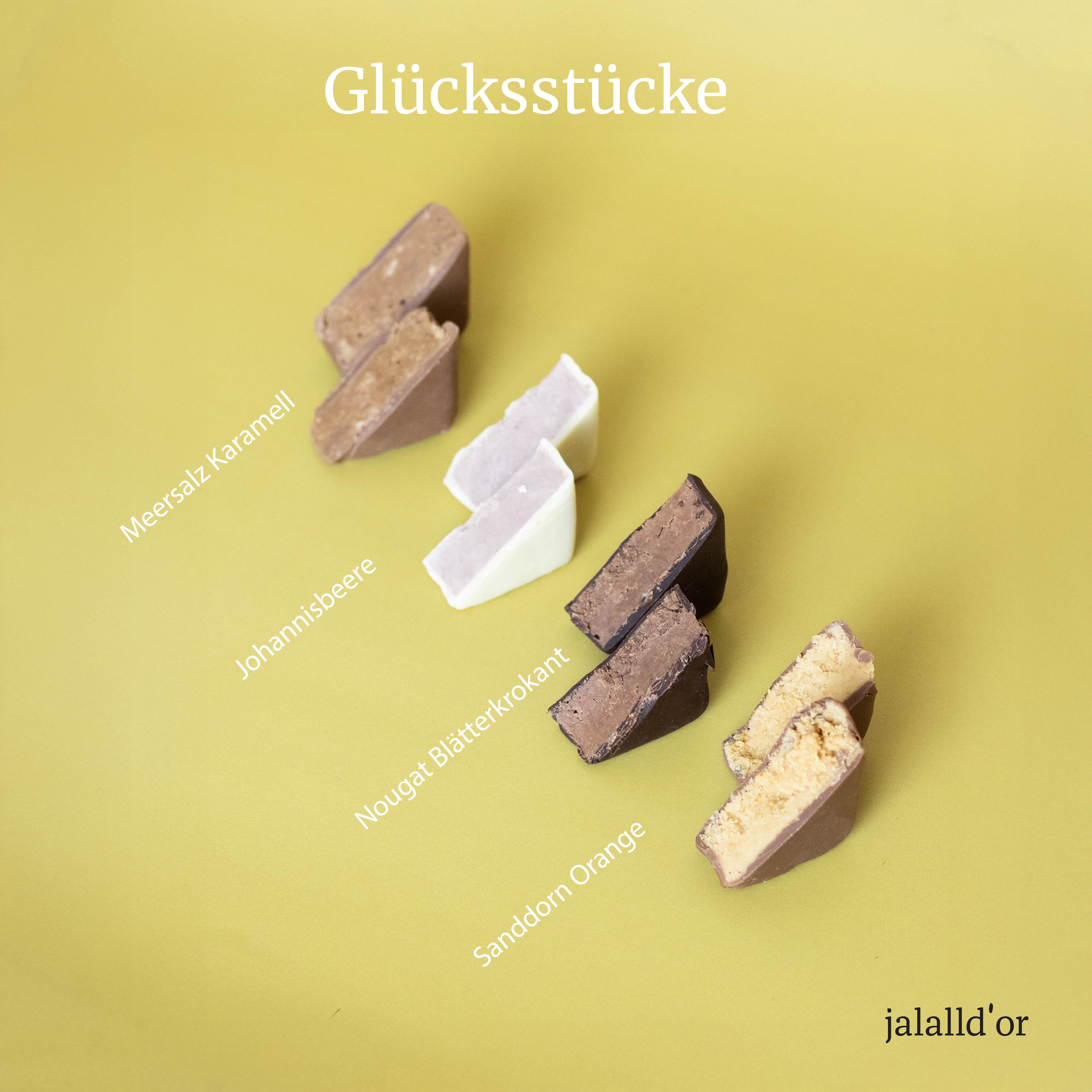 Glücksstück – handgemachte Pralinen im Online ShopEntdecke unsere Glücksstücke: Einzeln verpackte Pralinen, die aussehen wie große Bonbons und einen echten Wow-Effekt versprühen. Die feinen Trüffelpralinen vereinen hochwertige Zutaten mit handwerklicher Raffinesse.Vier verlockende Sorten machen das Genusserlebnis besonders:Johannisbeere – fruchtig und leicht säuerlichSanddorn-Orange – erfrischend und zitrusfrischMeersalz-Karamell – süß mit einem salzigen TwistNougat-Blätterkrokant – zart schmelzend mit knackigem KrokantPralinen einzeln verpacktJede einzelne Praline ist mit viel Liebe zum Detail in edles Goldpapier eingewickelt und mit einer schwarzen Banderole versehen – perfekt, um Deine Geschmacksknospen zu verführen oder als stilvolles Giveaway zu glänzen. Das macht unsere Glücksstücke aus:jede Praline von Hand einzeln verpackthandgefertigte Pralinen mit hochwertigen Zutaten für ein unverwechselbares Geschmackserlebnisedles Design in Gold und Schwarz – ein echter Hinguckerperfektes Giveaway: ideal, um anderen eine Freude zu machen oder sich selbst zu verwöhnenOb als Highlight im eigenen Schrank, als kleines Giveaway bei Freunden oder als liebevolles Mitbringsel – diese handgefertigten Pralinen machen jeden Moment zu etwas ganz Besonderem. Gönn Dir oder Deinen Liebsten einen goldenen Genussmoment – mit unseren Glücksstücken wird jeder Tag zur süßen Verführung!