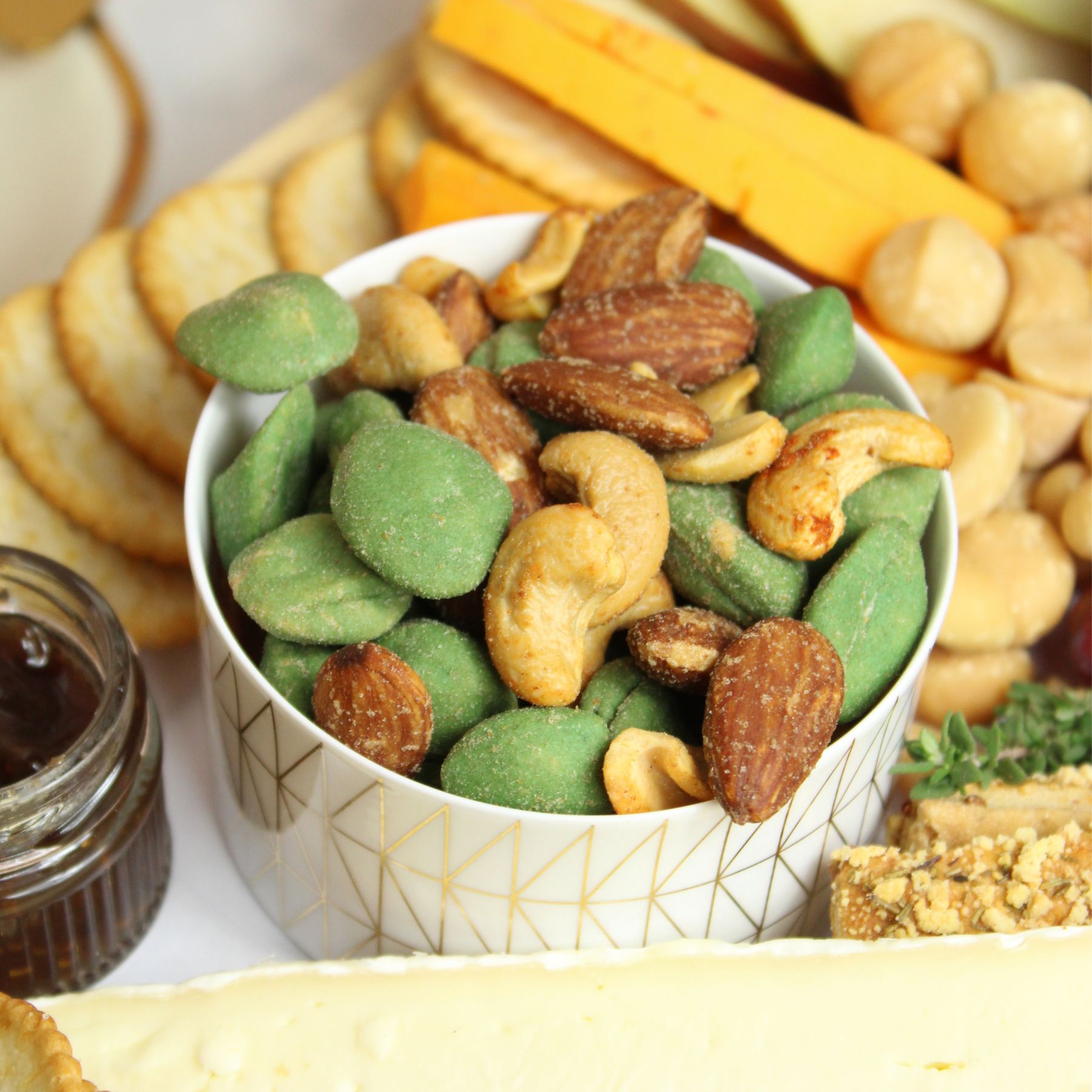 - Nüsse z.B. Maccadamia geröstet und gesalzen, die Nussmischung Feuer und Flamme und Pistazien
