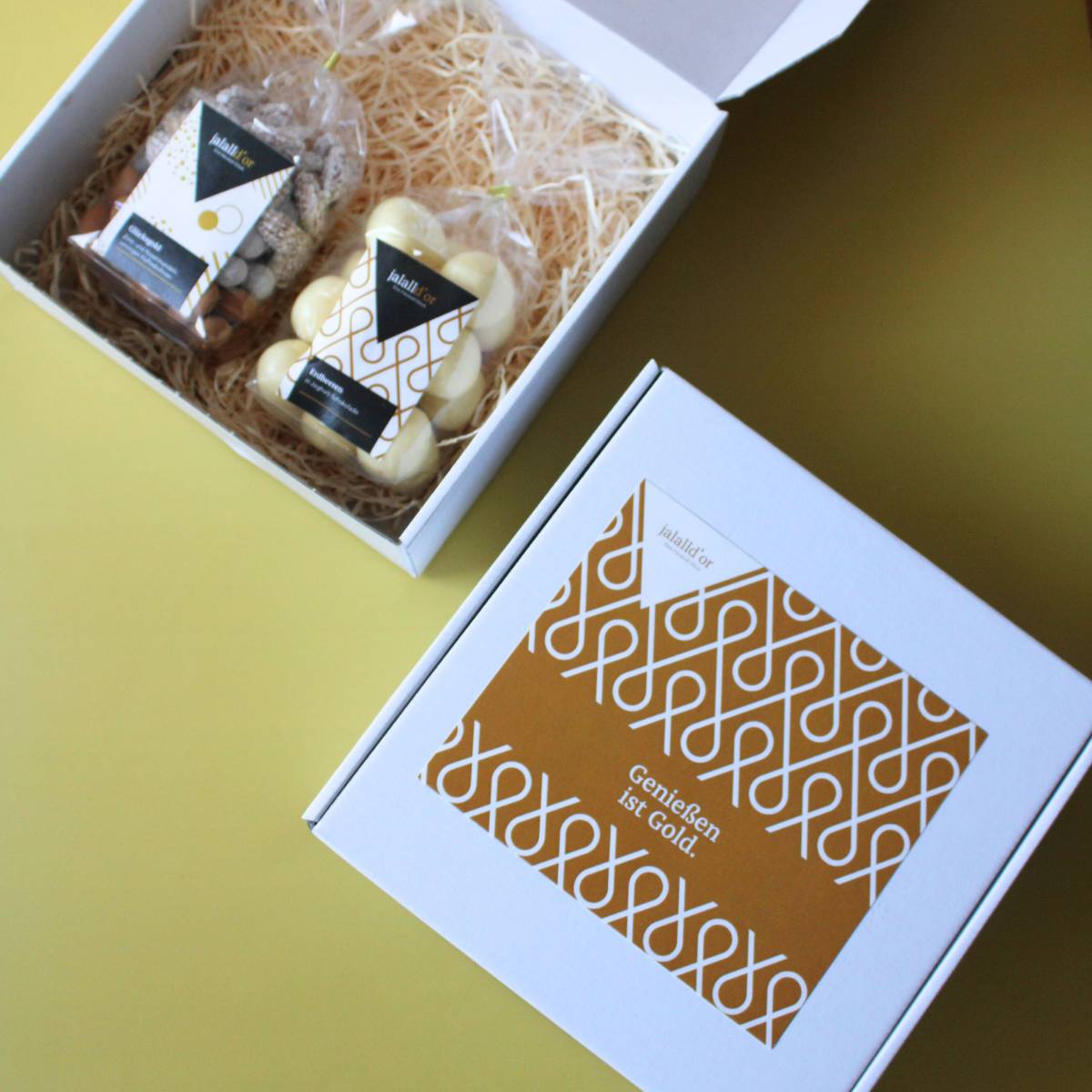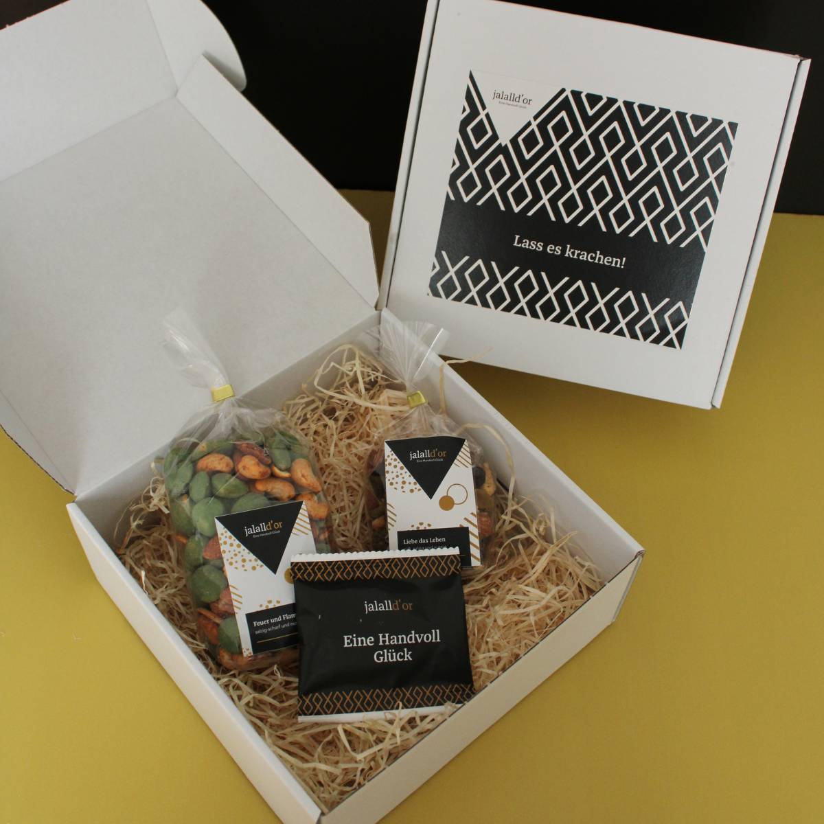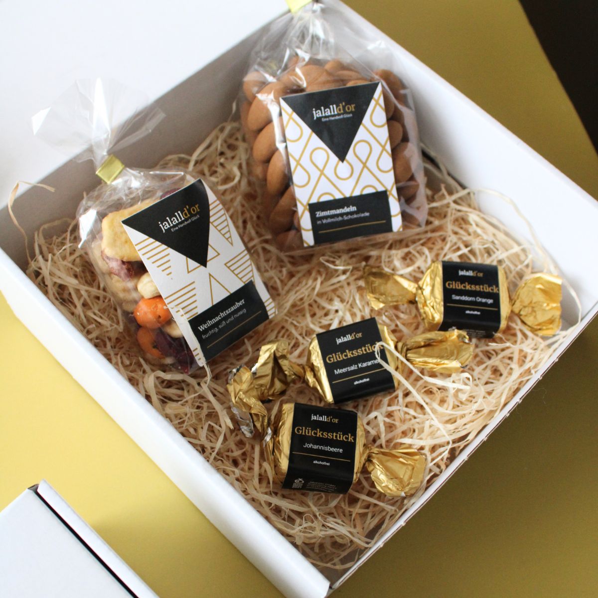 Wie wäre es mit einem Geburtstagsgeschenk oder Einer Handvoll Dankbarkeit? Dafür haben wir von Jalall D’or wundervolle Geschenkboxen und -dosen mit verschiedenen Botschaften kreiert. Sie sind eine schöne Möglichkeit zu zeigen, dass Dir Deine Mitarbeiter am Herzen liegen und Du ihren Einsatz über die vergangene Zeit wertschätzt.