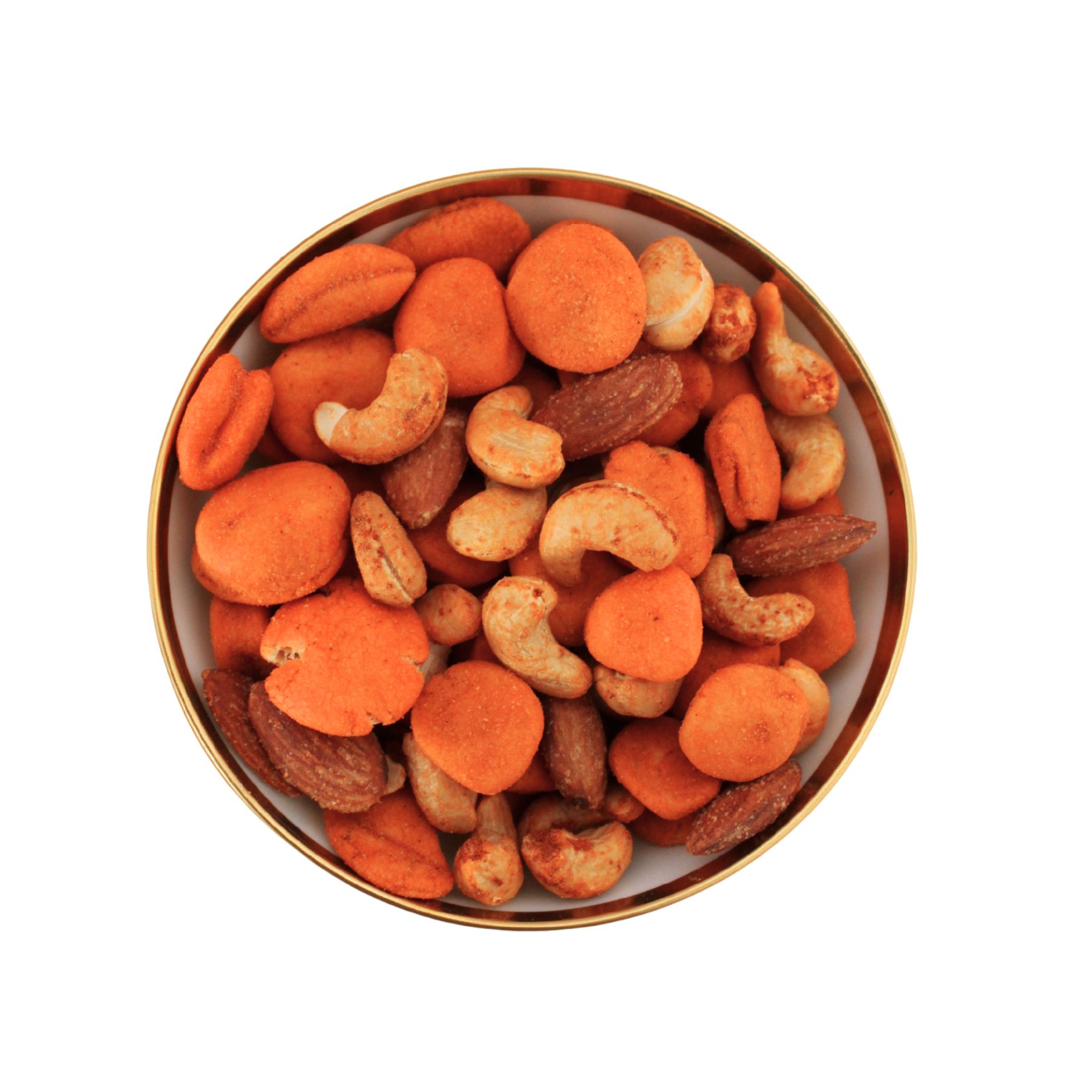 Mischung aus Nusskernen teilw. in Chiliteigmantel, teilw. geröstet und gesalzen, teilw. gewürzt