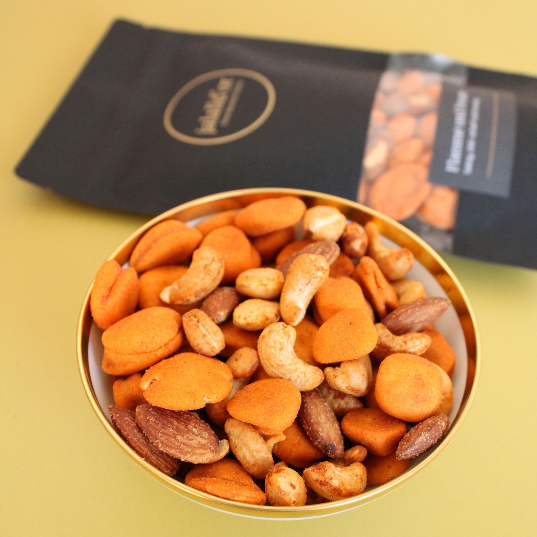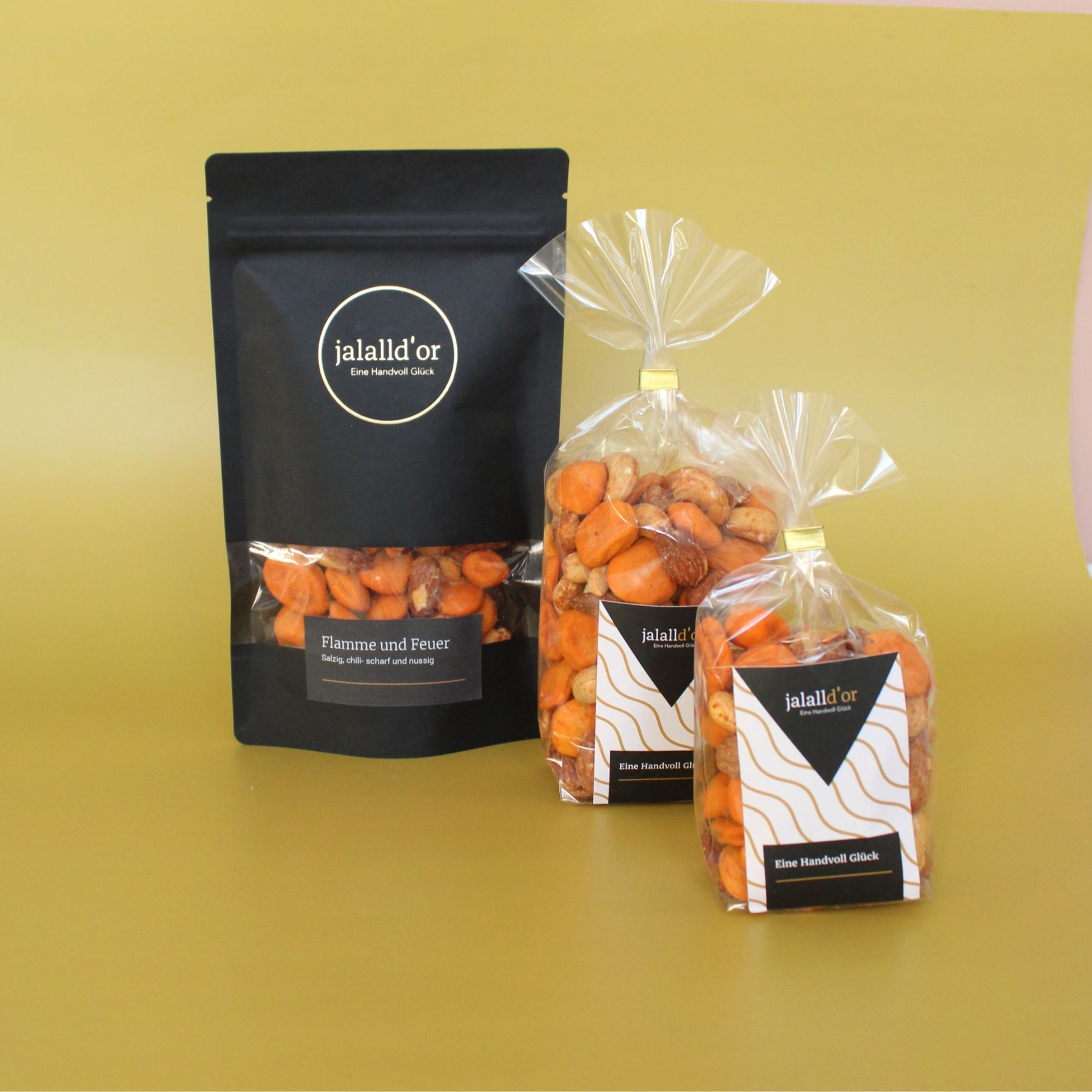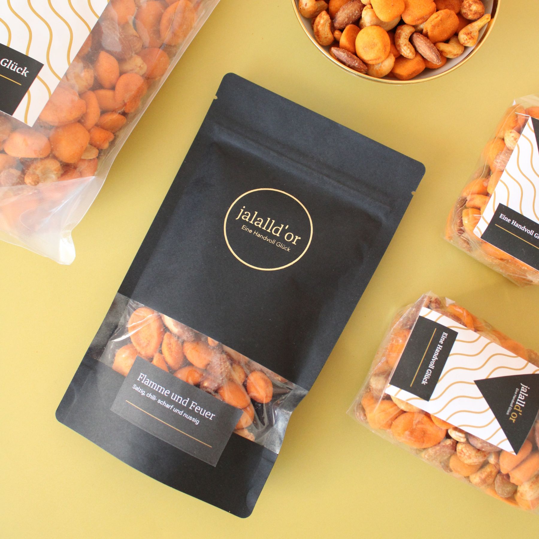 - Flamme und Feuer: chili-scharf und salzig nussig mit Chili-Erdnüssen, Chili-Cashewkernen und Salzmandeln
