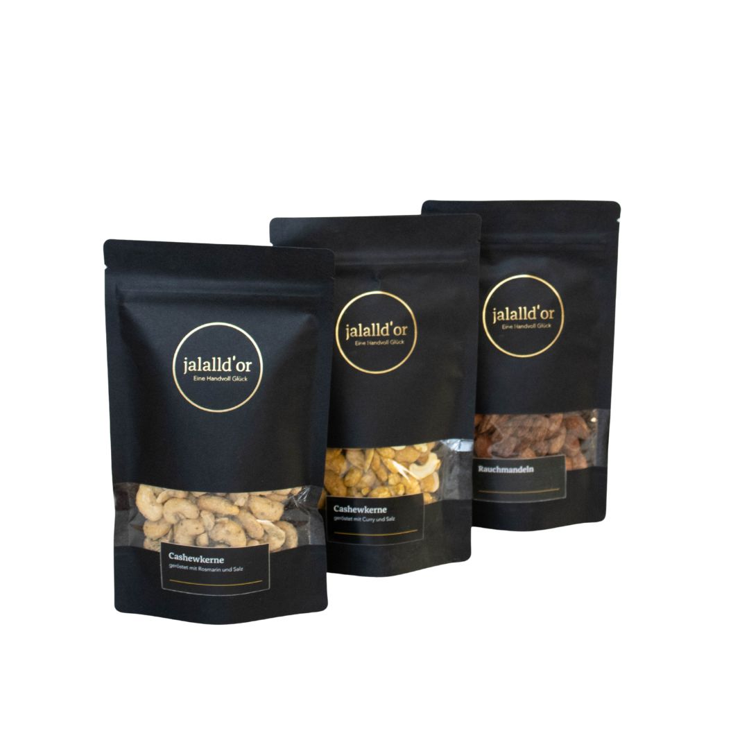 Ob als Geschenk für Feinschmecker, als Snack-Trio für den Abend mit Freunden oder als edle Beigabe zu einem Weinpräsent – dieses Bundle steht für puren Jalall-D’or-Genuss: köstlich, kreativ und voller Liebe zum Detail.
