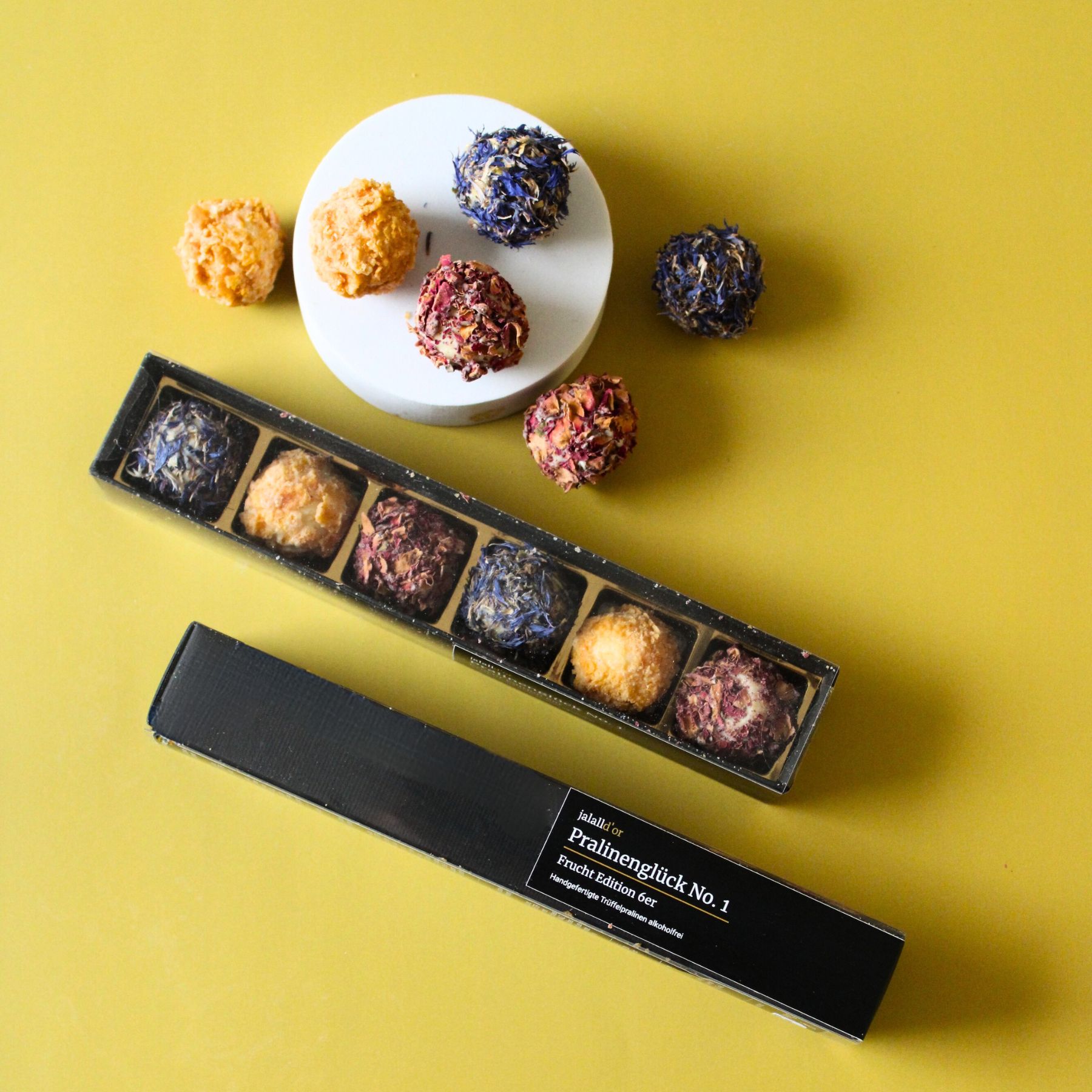 Kleine Meisterwerke, die Herzen höherschlagen lassen: Unser Pralinenglück No. 1 vereint zarte Fruchttrüffelpralinen – liebevoll von Hand gefertigt und ganz ohne Alkohol.